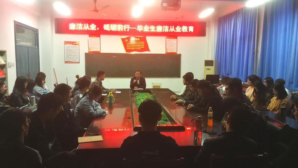 11月11日,我院在学院楼会议室开展毕业生廉洁从业教育活动。2021届毕业生代表50余人参加本次活动,活动由学院党委纪检委员、团委书记贾普君主讲。