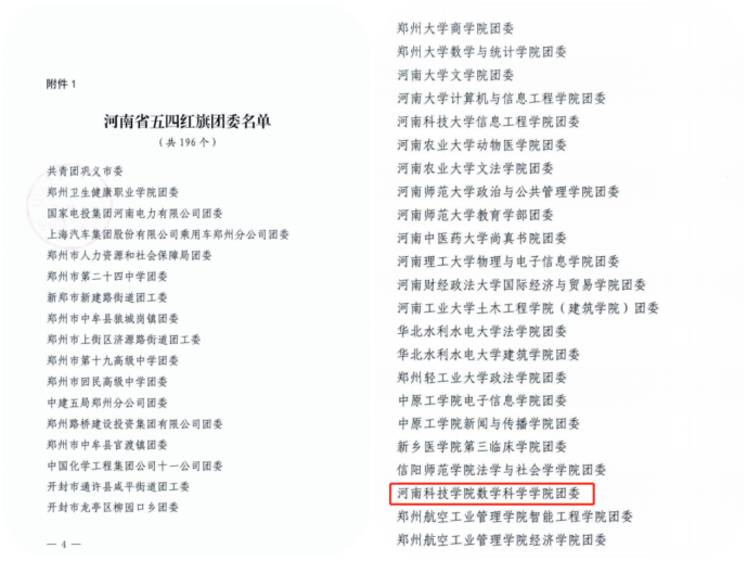 为充分发挥示范引领作用,激励各级团组织和广大团员、团干部踔厉奋发、创先争优。近日,共青团河南省委“两红两优”光荣榜揭晓,数学科学学院团委获评2023年河南省五四红旗团委荣誉称号。