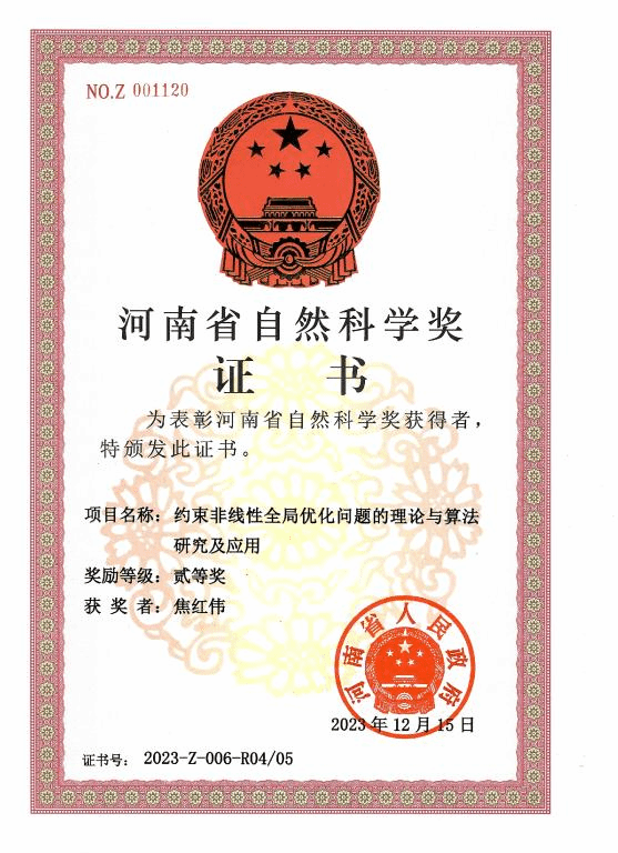 近日,河南省人民政府公布了2023年度河南省科学技术奖励决定,我院陈永刚教授主持申报的项目“受限复杂动态系统的分析与控制”获三等奖,焦红伟教授参与申报的项目“约束非线性全局优化问题的理论与算法研究及其实际应用”获二等奖。这两项奖励是我省设立自然科学奖以来我校的首次获得。
