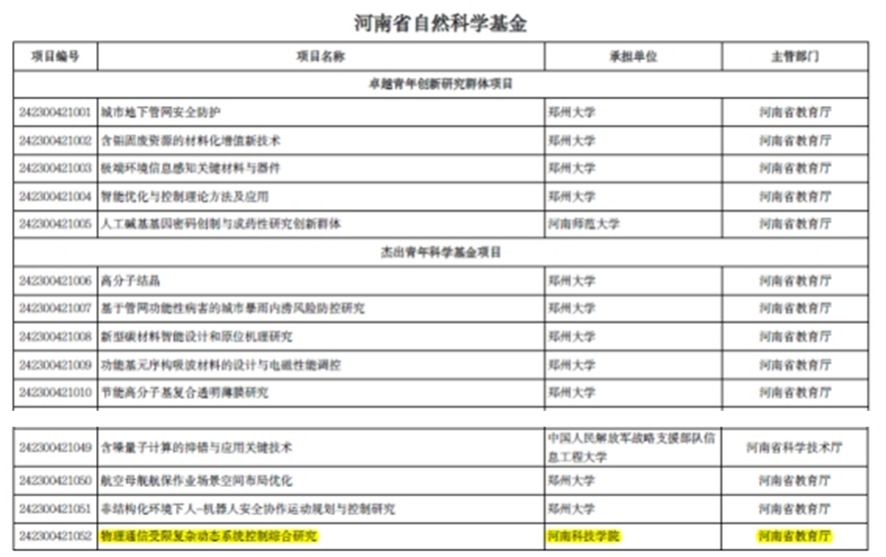 近日,河南省科技厅下达了河南省二○二四年科技发展计划的通知,数学科学学院陈永刚教授主持的项目“物理通信受限复杂动态系统的控制综合研究”(项目编号:242300421052)获批河南省自然科学基金杰出青年科学基金项目。