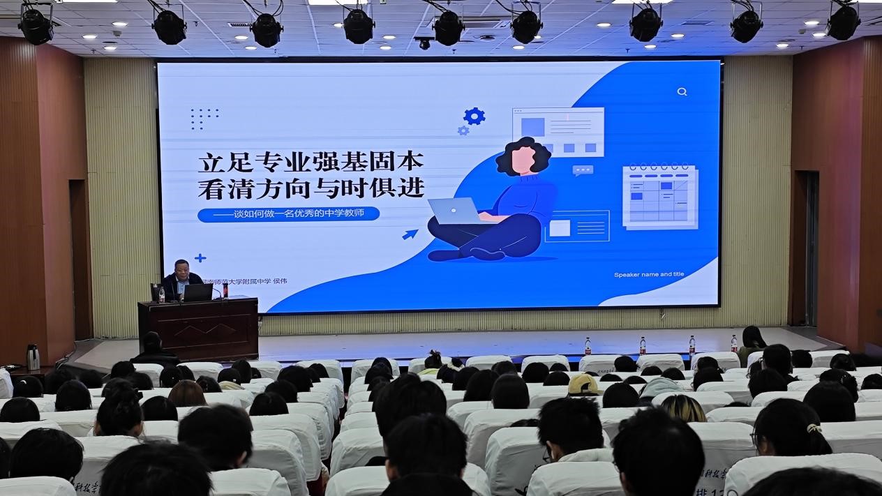 侯伟首先聚焦于“立足专业强基固本”的核心议题,阐述了“修品德、精教学、善管理、强科研、展专长”的全面发展理念,以深入浅出的方式揭示了把立德树人作为教育根本任务的深远意义。紧接着,他结合自身丰富的教育实践经历,鼓励学生们应紧跟时代步伐,勇于探索创新,避免固步自封,从而实现个人职业成长与教育事业的同步提升。在此基础上,侯伟进一步分享了成为一名卓越中学教师的关键要素,强调教师应具备将复杂知识简单化的教学艺术、实施个性化教学策略的智慧,以及成为学生心灵导师的重要职责,这些见解深刻触动了在场学生的心灵。