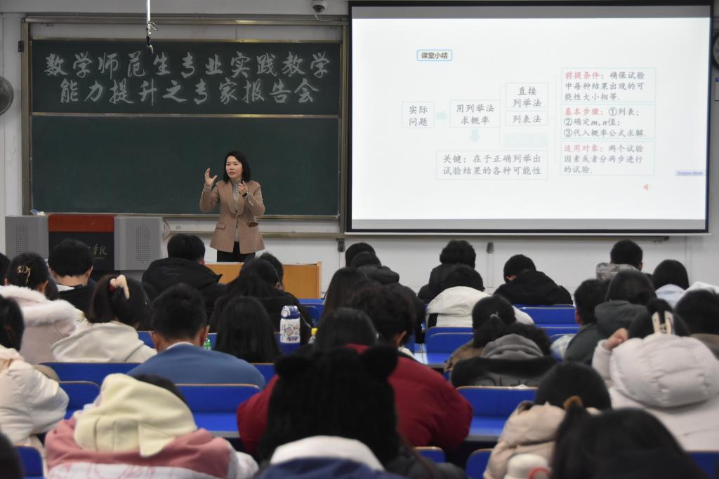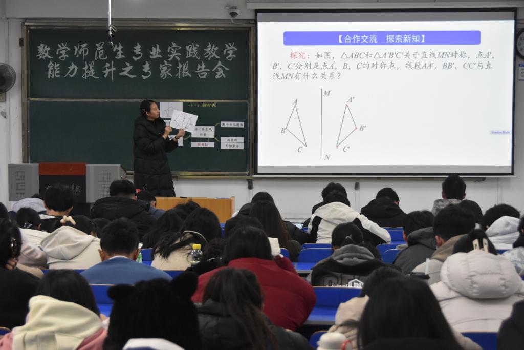 12月5日,数学科学学院举行数学师范生专业实践教学能力提升之专家报告会,邀请新乡学院附属中学初中数学教研组组长宋艳梅、新乡学院附属中学老师靳淼,于八号楼合三教室分别以“讲授微型课的注意事项”为主题作报告和以《轴对称》为课题作汇报。2023级、2024级数学与应用数学专业全体学生参加此次报告会,会议由院长董瑞主持。