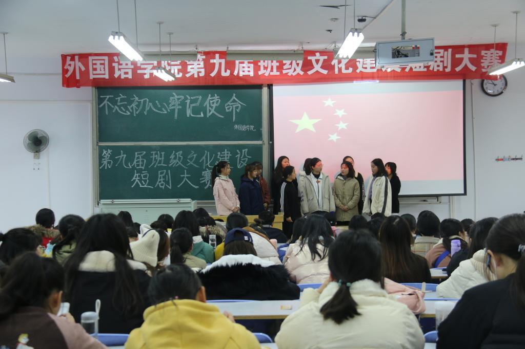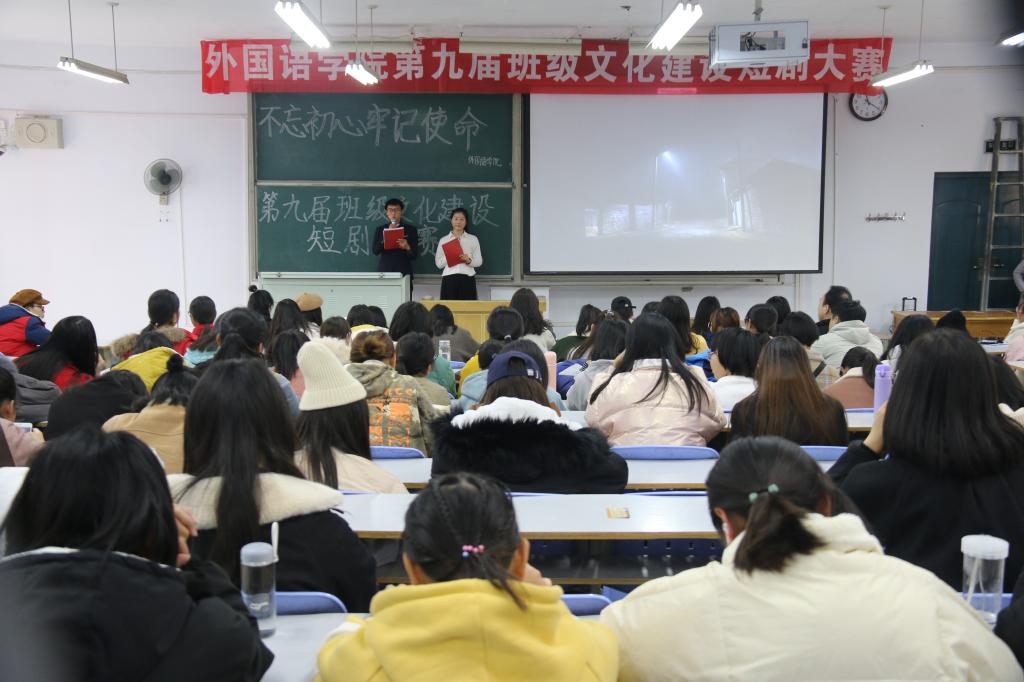11月29日上午,外国语学院举第九届班级文化建设短剧大赛在十合六举行。外国语学院党委副书记龚俊朋,团委书记张高峰、副书记时文鹏及团委学生会成员代表出席并担任比赛评委,2019级全体同学参加比赛。