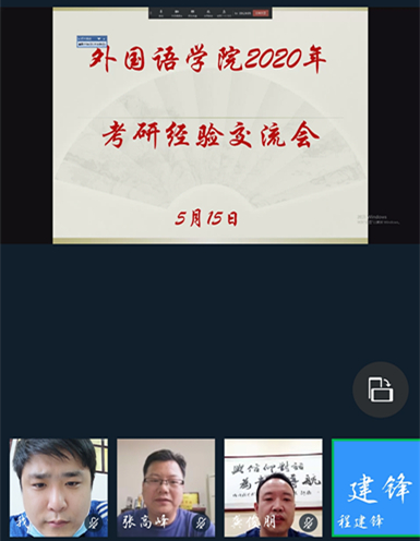 会上,龚俊朋首先做了动员讲话。他说,在全国上下抗击疫情的时刻,希望2017级考研的同学们要有紧迫感,要按照学校要求安心在家,停课不停学,做好考研规划,提高学习效率。程建锋博士就英语专业考研谈了具体建议。他说:第一,大家要根据对英语语言学、文学、教育等的兴趣和第二外语成绩,选择相应的英语或翻译硕士专业。第二,学校的选择及特点。根据学校和相关专业的强弱,同学们可按照自己的实际情况,合理定位,正确选择报考院校和专业。第三,考研需要正确的方法以及学习计划,坚持到底才能最终走向胜利,实现自己到更高学府的深造梦想。