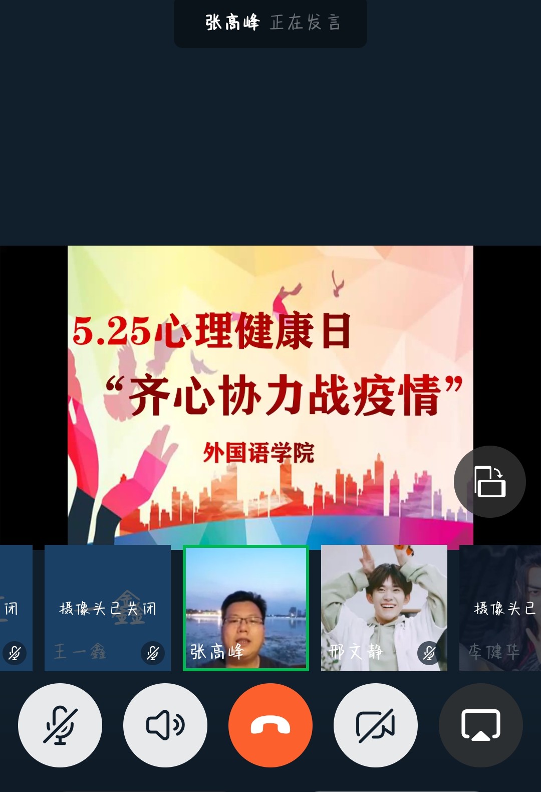 疫情防控期间,为缓解学生心理压力,关爱自我,关注心理健康,提升心理素质,外国语学院于5月23日晚通过网络视频形式举行了5.25心理健康日—“齐心协力战疫情”活动。本次活动由外国语学院团委书记张高峰主持,2019级全体学生参与。