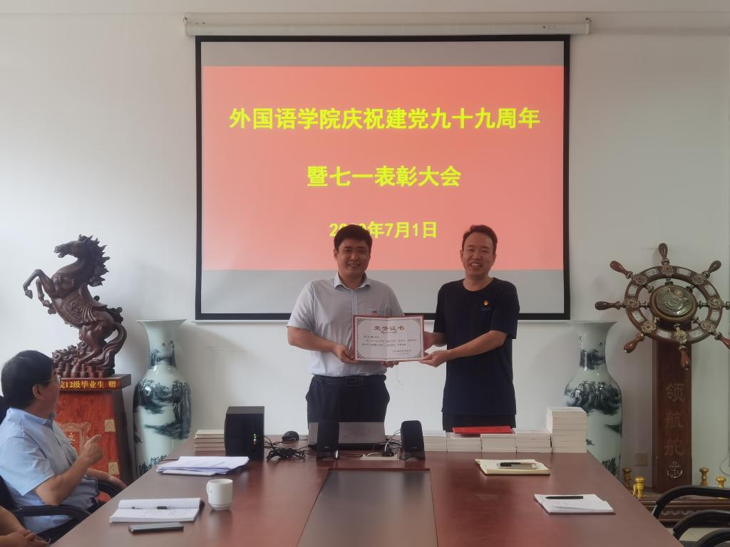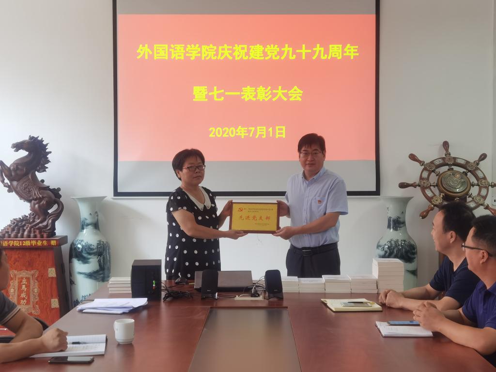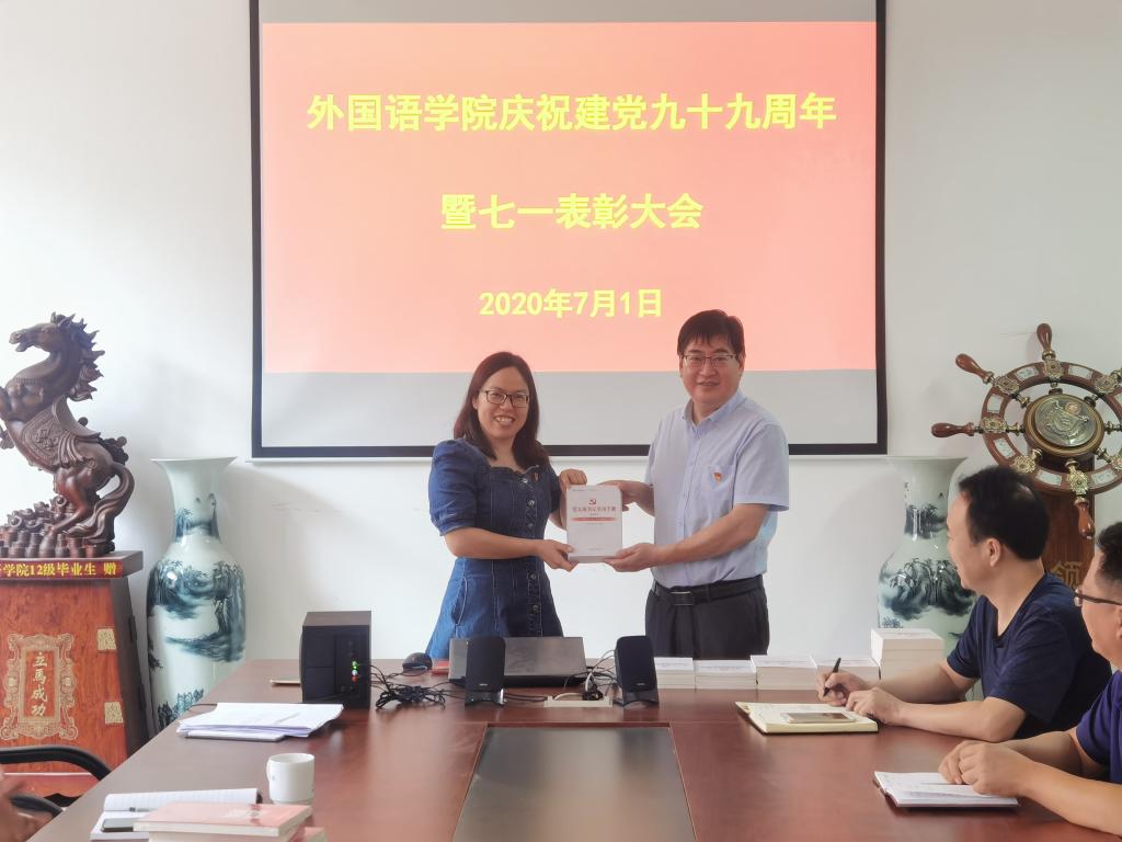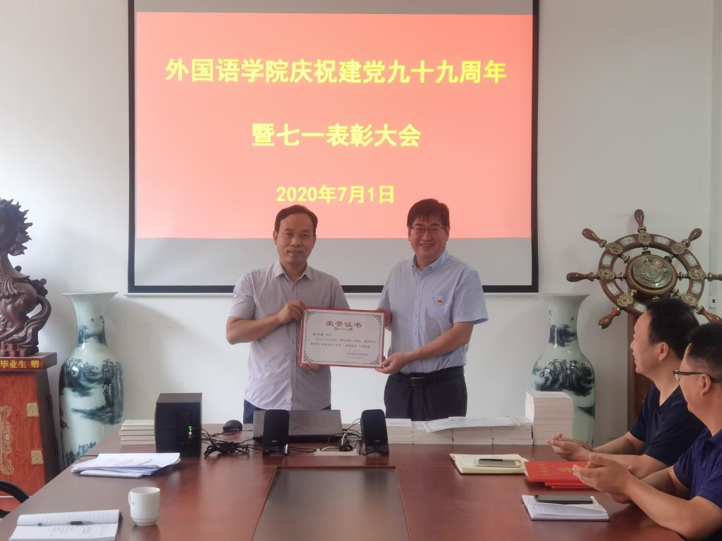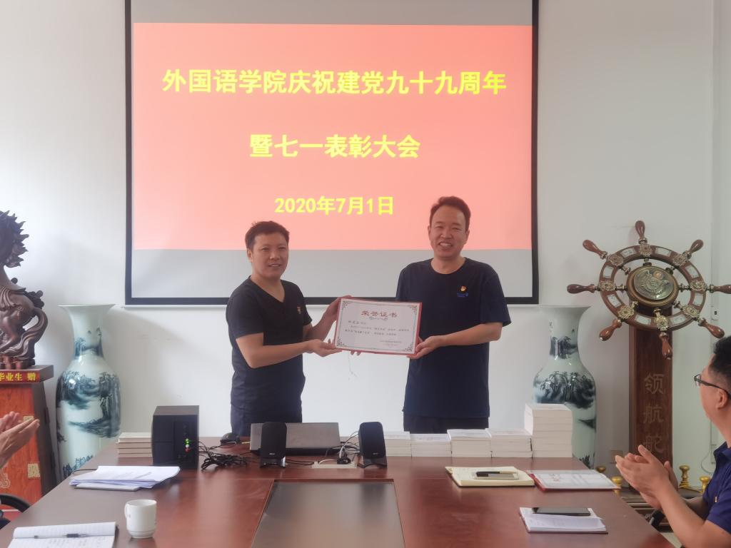活动伊始,与会人员共同观看了高校党组织战“疫”示范“七一”专题微党课。直播结束后,举行了隆重的“七一”表彰颁奖仪式,学院党委书记徐兆栋为获得2019-2020学年先进基层党组织——商务英语翻译教研室党支部颁发了“先进党支部”奖牌,为优秀党务工作者颁发了荣誉证书,并向各支部书记发放了学习书籍,副书记龚俊朋为优秀党员颁发了荣誉证书。徐兆栋说,从1921年建党以来,中国共产党历经99载风雨洗礼,一代又一代中国共产党人,以担当和气魄,用鲜血和生命挺起了中华民族的脊梁,实现了祖国独立和人民解放,建立了彪炳史册的不朽功勋。希望受到表彰的支部和个人进一步锤炼忠诚干净担当的政治品格,把初心和使命落实到本职岗位上,充分发挥先锋模范作用,勇挑担当、扎实工作,确保学校各项决策部署落地生根,奋力绘就“最美科院”新画卷作出新的更大贡献。