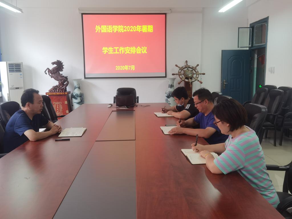 为做好暑假期间学生工作,7月10日上午,外国语学院召开暑期学生工作会议,学院党委副书记龚俊朋,团委书记张高峰、团委副书记时文鹏及兼职辅导员参加会议。