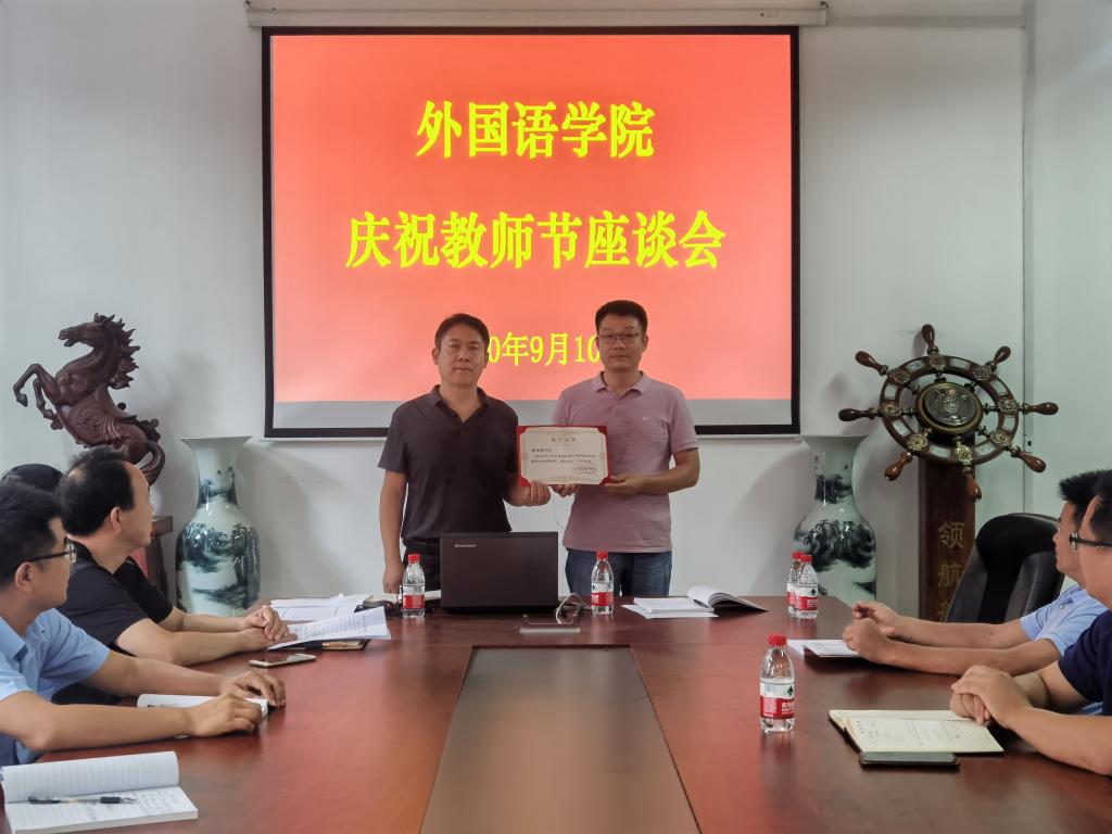 在7号教学楼211会议室,外国语学院召开了庆祝教师节座谈会,学院党政领导班子、教师代表参加了座谈会。座谈会由党委书记徐兆栋主持。会上,院长李会民宣读了河南科技学院党委书记周志远、校长李成伟致全校教师的慰问信,并同徐兆栋一起为“科院最美教师”、“优秀教师”颁发了证书。徐兆栋在讲话中希望受表彰的教师勿忘立德树人的初心,牢记为党育人、为国育才的使命,充分发挥示范带头作用,珍惜荣誉、再接再厉、再立新功。座谈会中,大家踊跃发言,围绕学科专业建设、教学科研、研究生教育、实验室建设、团学工作及学生就业等方面为学院发展提出了宝贵的意见。