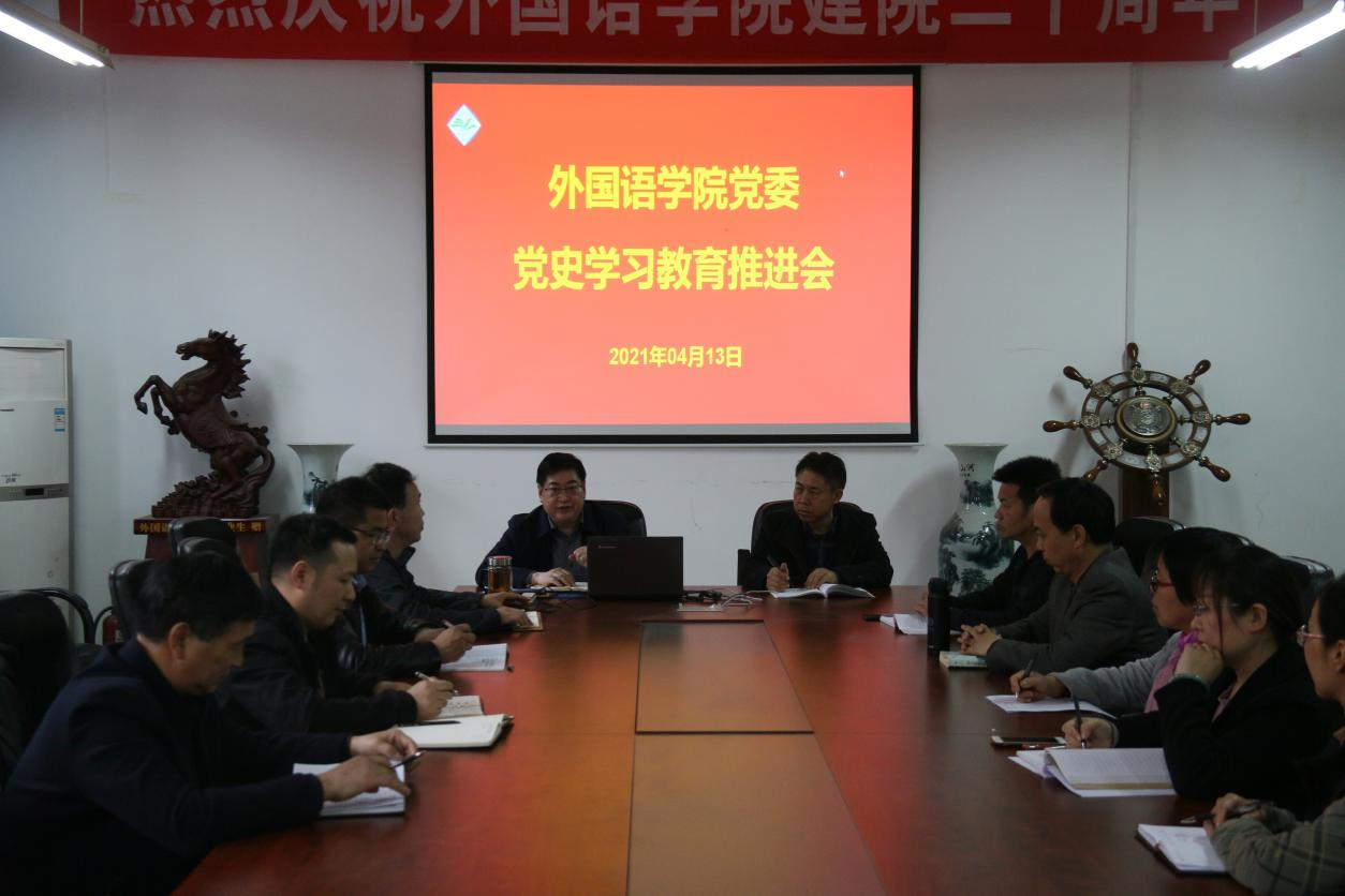 为深入贯彻落实习近平总书记在党史学习教育动员大会上的重要讲话精神,推动党史学习教育走深走心走实,4月13日下午,外国语学院党委在7#211会议室召开党史学习教育推进会。学院党委书记徐兆栋,院长李会民,副书记龚俊朋,副院长万文龙、程建锋等领导出席会议,党委委员、党支部书记参加了会议。