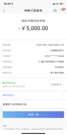 涓涓爱心细流,汇就同心江河。灾情发生后,天南海北的外院学子以不同形式投入防汛抗灾之中,19级在校生贺今毅在家乡积极参与防汛工作,作为退伍大学生,连续三天没有休息,配合地方抢救受灾群众。17级张明扬积极联系学院,要求参加志愿服务,18级孙百慧、陈翘楚、李苏燃等30余位新乡市未返乡备战考研学生也积极响应学院号召,在校内外进行各种防汛救灾志愿服务。04级毕业生侯文普、姚硕贤积极为灾区联系救援物资;05级毕业生冯博、11届毕业生张少华听说母校受灾,立即联系在校教师,各汇款5000元,还有毕业生臧彪、方婷婷、邹玉斌、伊雅婷、王慧钰、王虹等都积极响应;学院30多名教师都奉献爱心,捐款助力学校防汛抗灾。