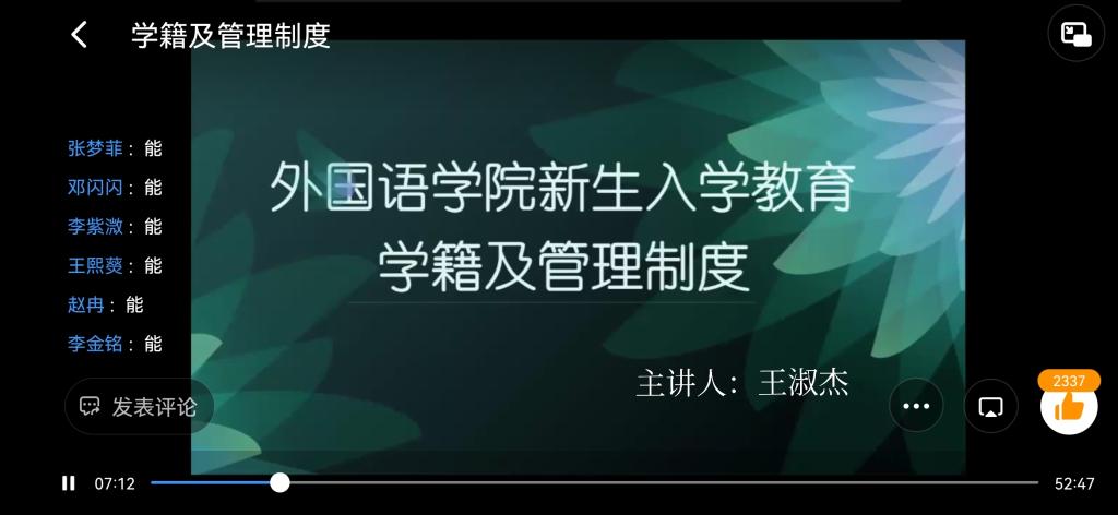9月14日上午,辅导员王淑杰以“学籍管理与学业规划”为题,向2021级新生详细介绍了有关学籍方面的相关事项,涉及学籍注册、入学复试、转专业、转学休学等。随后,她还结合往届学生的具体案例提醒新生要诚实守信,积极完成学籍注册,绝不弄虚作假,以确保毕业生时顺利取得毕业证、学位证。