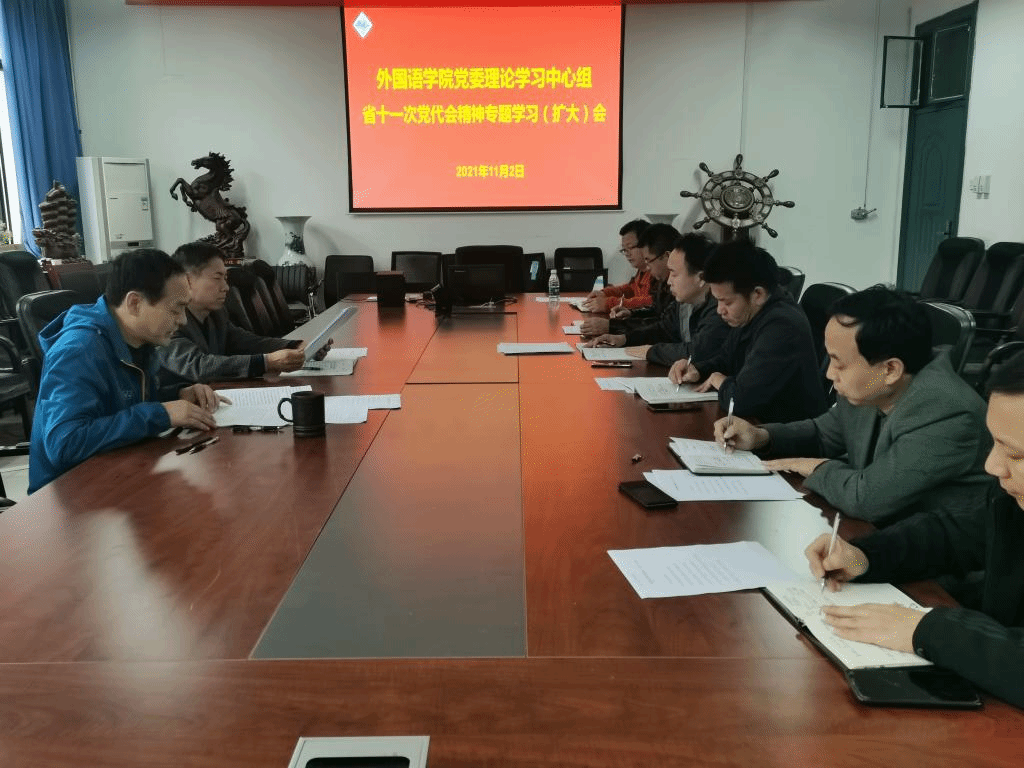 11月2日,外国语学院党委理论学习中心组在7号楼211会议室召开学习(扩大)会,传达学习省第十一次党代会会议精神,学院党政班子成员、党委委员参加会议。会议由院党委书记张忠迪主持。