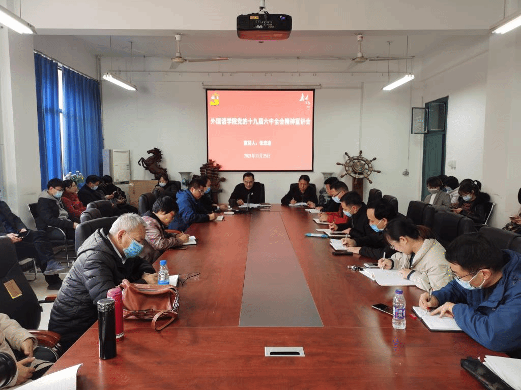 为深入学习贯彻党的十九届六中全会精神,切实把思想和行动统一到六中全会精神上来,11月25日下午,外国语学院举行党的十九届六中全会精神宣讲会。学院班子成员、支部书记及全体教职工参加会议。会议由学院党委书记张忠迪主持。