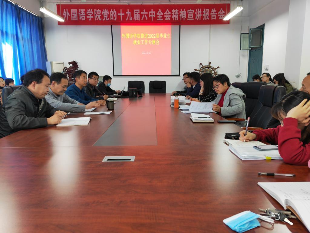 3月10日下午,外国语学院在学院会议室召开了2022届毕业生就业工作专题会。学院党政领导及全体教职工参加了会议,会议由院党委副书记龚俊朋主持。