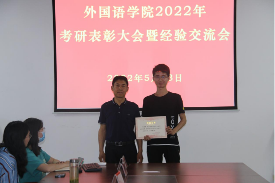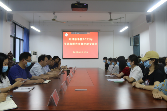 5月23日晚,外国语学院在7211会议室召开2022届毕业生考研表彰暨经验交流会。学院党委书记张忠迪、院长李会民、党委副书记龚俊朋、副院长万文龙出席会议,团委书记张高峰、各年级辅导员和部分学生代表通过线上和线下形式参加了会议。会议由龚俊朋主持。
