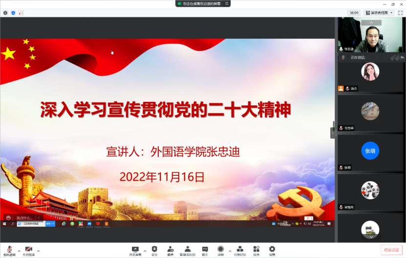 为深入学习宣传贯彻党的二十大精神,11月16日下午,外国语学院举行党委理论学习中心组(扩大)学习会,专题学习党的二十大精神。学院班子成员、党委委员、支部书记及科级以上干部参加了会议。会议通过腾讯会议形式进行,由学院党委书记张忠迪主持。