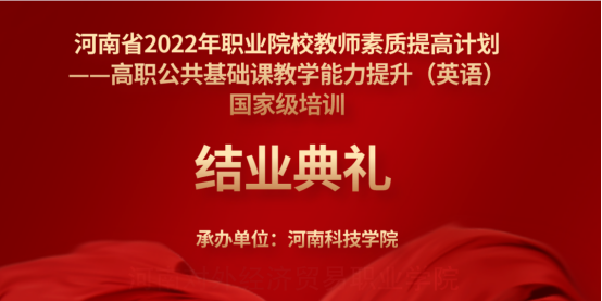 3月3日,由河南省教育厅主办,河南科技学院承办的“2022年河南省职业院校教师素质提高计划——《英语(高职)》骨干教师教学能力提升国家级培训”在继续教育学院、外国语学院的精心组织下取得圆满成功。外国语学院院长李会民、副院长万文龙出席会议。国培班管理人员、全体学员参加了典礼。结业典礼由外国语学院副院长程建锋主持。