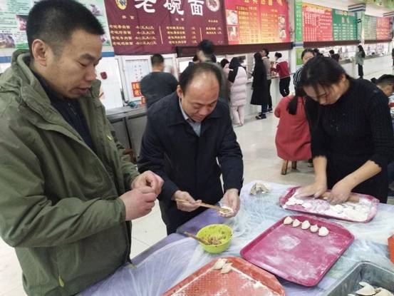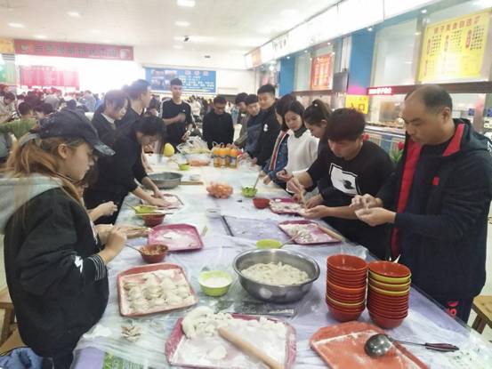 在学校餐厅内,由餐桌临时拼凑成的操作台上,同学们合理分工,女生部,心理部,资助中心,实践部,文艺部,办公室,学习部女生多一些的部门负责包饺子;外联部,生活自律部,宣传部,组织部的同学们负责擀面皮;体育部负责摆放,送包好的饺子去煮。同学们个个动作娴熟,不一会儿,面前的盘子里就放满了饺子。大家有说有笑,相互切磋包饺子的技巧,彼此比较着饺子的形状,热闹非凡。饺子包好后,老师们还邀请学院的10余名海南学生一起吃饺子,让他们也感受到体育学院大家庭的一份温暖。