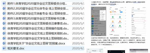 为保障“云答辩”的顺利进行,学院前期做好大量工作,高泳、教学秘书李佳翼会同部分答辩教师,充分商议沟通,制定了《体育学院2020届本科毕业论文线上答辩实施方案》、《体育学院2020届本科毕业论文线上答辩相关细则》、《体育学院2020届本科毕业论文线上答辩相关平台操作指南》等办法,并分批次对答辩委员、答辩秘书及2020届参与答辩的毕业生进行培训。