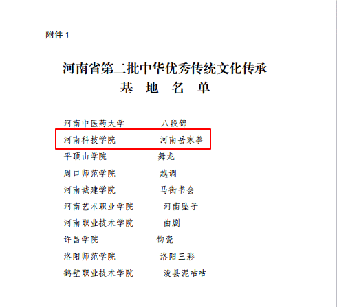 近日,河南省教育厅下发《关于公布全省第二批批中华优秀传统文化传承基地的通知》,我院申报的“河南岳家拳”项目成功入选,成为全省第二批10个中华优秀传统文化传承基地创建单位之一。