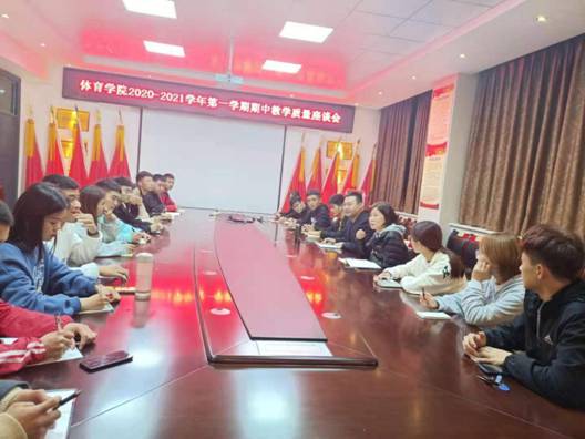 根据学校和教务处的统一部署,为了提高课堂教学质量,促进优良学风建设,体育学院期中教学质量座谈会于11月12日晚上在8号教学楼8114会议室召开。学院副院长高泳出席会议,教学秘书及学生代表40余人参加了此次座谈。