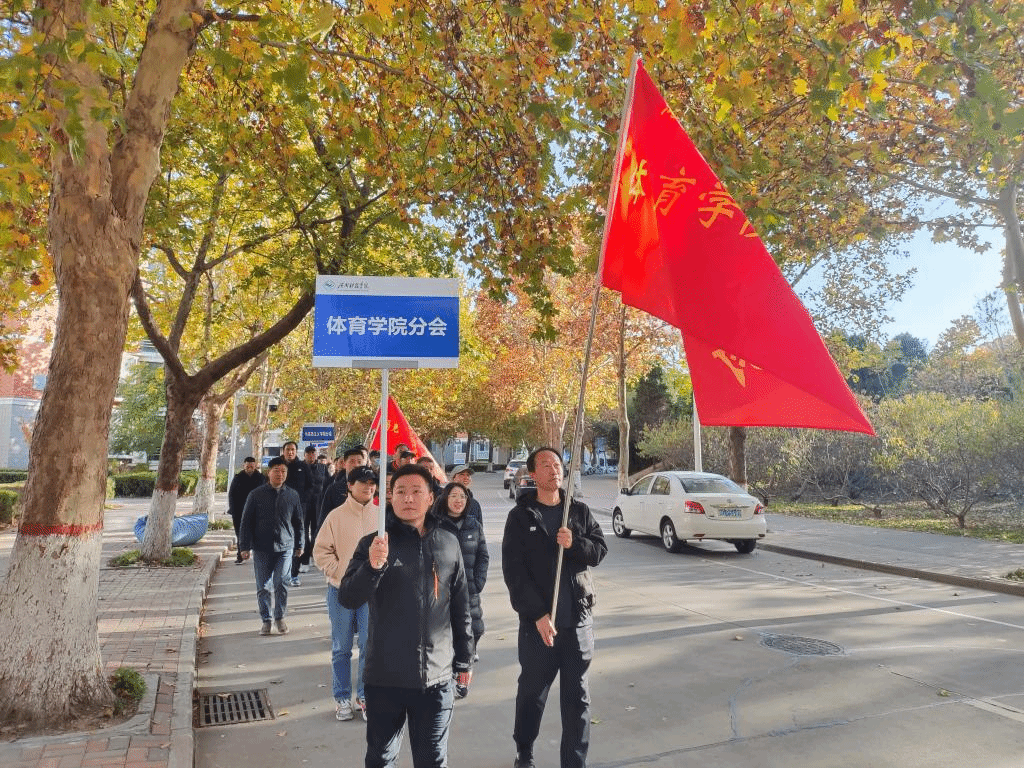 11月23日,我院分会组织20余名教职工参加校工会“冬季健身月”启动仪式及教职工健步走活动,老师们一个个精神抖擞,步履昂扬,高大的身躯、强健的体格、整齐的队伍、飞扬的旗帜展现了体育学院教师生机勃勃、奋发向上的工作热情和良好的精神面貌。