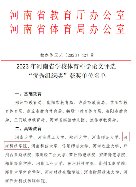 近日,河南省教育厅和河南省体育局联合印发《2023年河南省学校体育科研论文征集评审结果的通知》,我校荣获“优秀组织奖”。