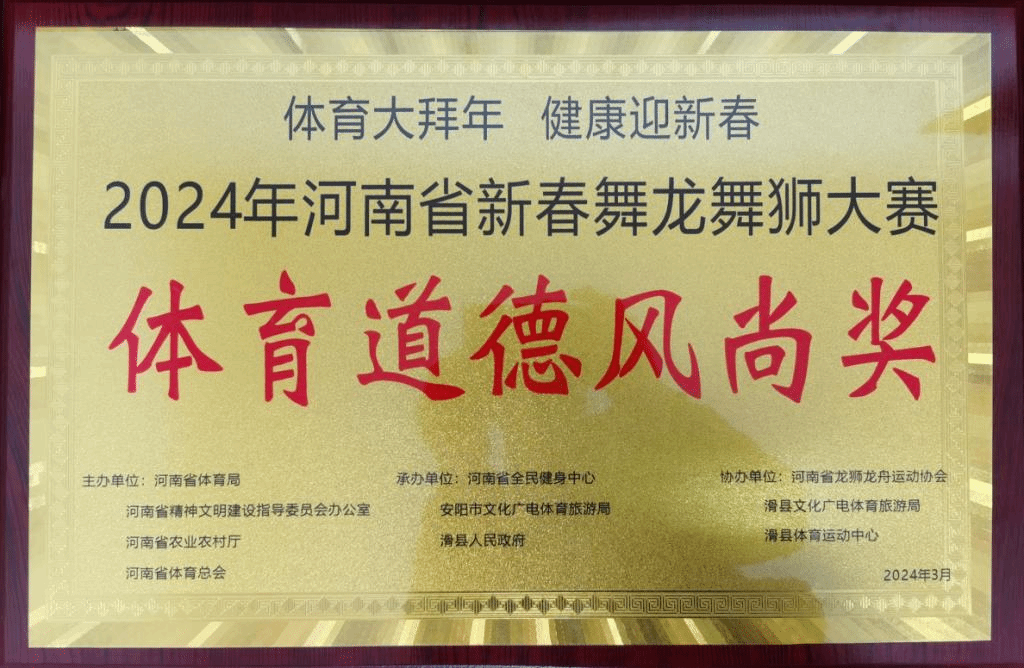 荣获河南省新春舞龙舞狮大赛“体育道德风尚奖”