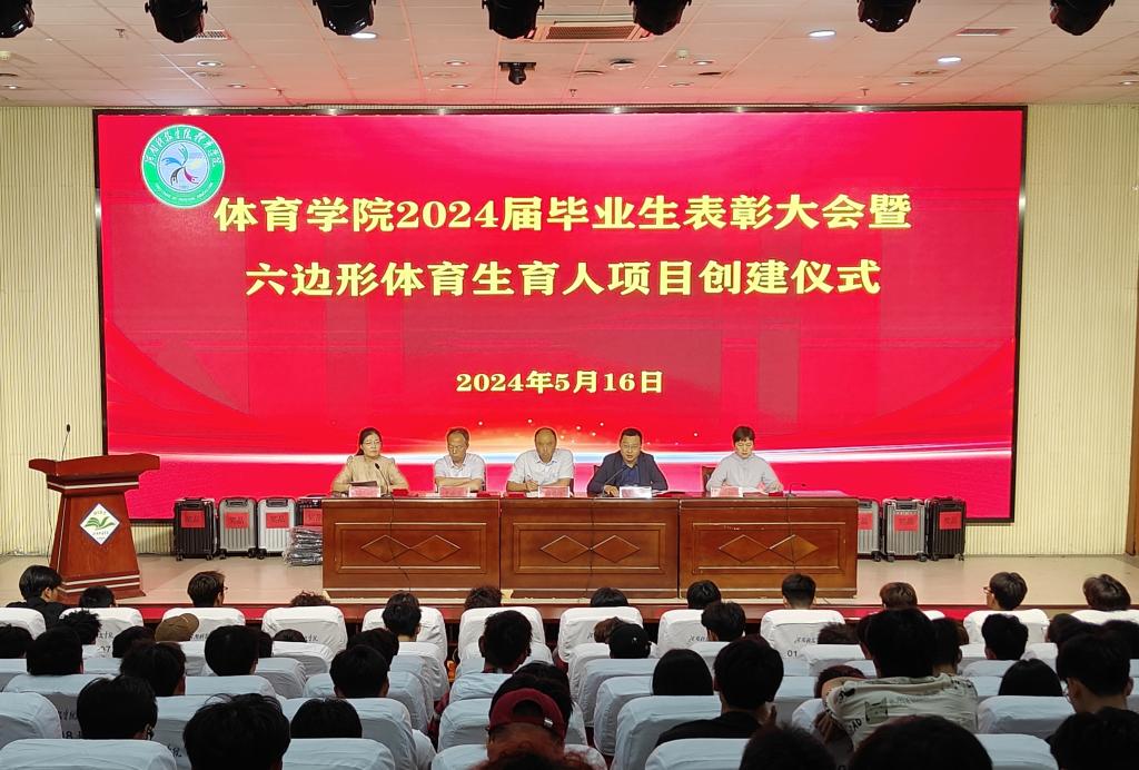 5月16日下午,体育学院在图书馆一楼报告厅举行2024届毕业生表彰大会暨六边形体育生育人项目创建仪式。学院党委书记徐现峰、院长高泳、党委副书记梁瑞、副院长于振勇、副院长李娜出席会议,全体辅导员、2024届考研学生代表、优秀应届毕业生、六边形体育生及低年级学生代表共200余人参加会议。会议由梁瑞主持。
