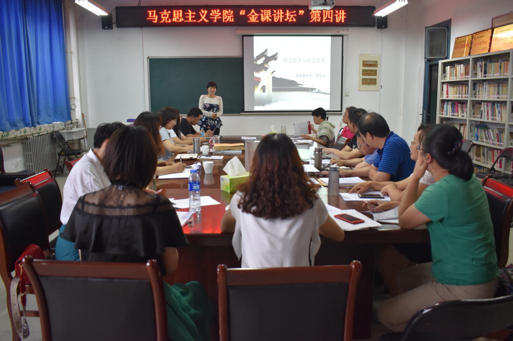 为更好地贯彻习近平总书记在全国思政课教师座谈会上的讲话,切实提高思政课教学实效性,建设大学生真心喜爱、终身受益的思政课,马克思主义学院于2019年6月21日下午4点30分,在8号教学楼508会议室举行了思想政治理论课“金课论坛”第四讲,主讲人为徐俊蕾老师,教学副院长孙喜英主持,学院全体教工聆听了报告。