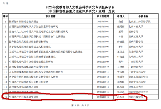 日前,教育部公布了2020年度教育部人文社会科学研究专项任务项目(中国特色社会主义理论体系研究)立项名单(教社科司函〔2020〕35号),我院赵东喜教授主持的《中国共产党自我革命史研究》获批立项资助。