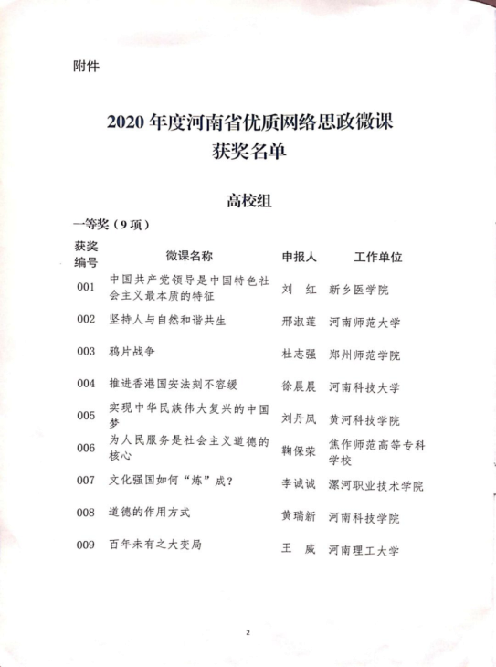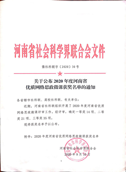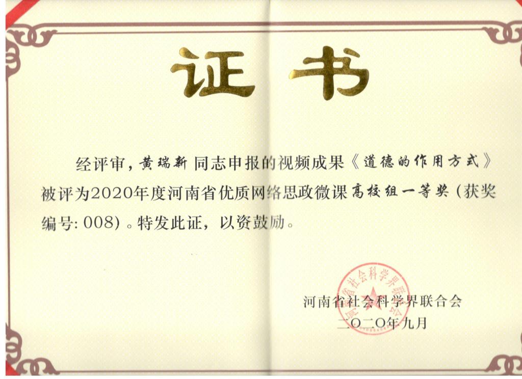 从河南省社科联《关于公布2020年度河南省优质网络思政微课获奖名单的通知》中获悉,我院黄瑞新老师的微课《道德的作用方式》荣获高校组一等奖。