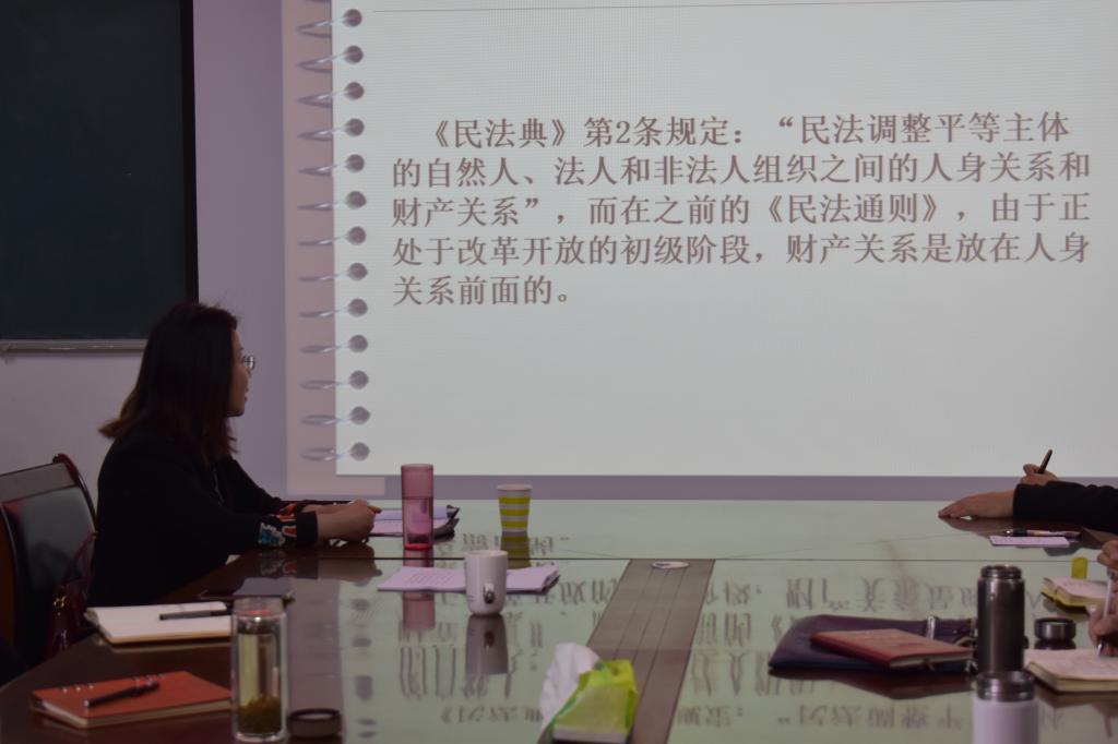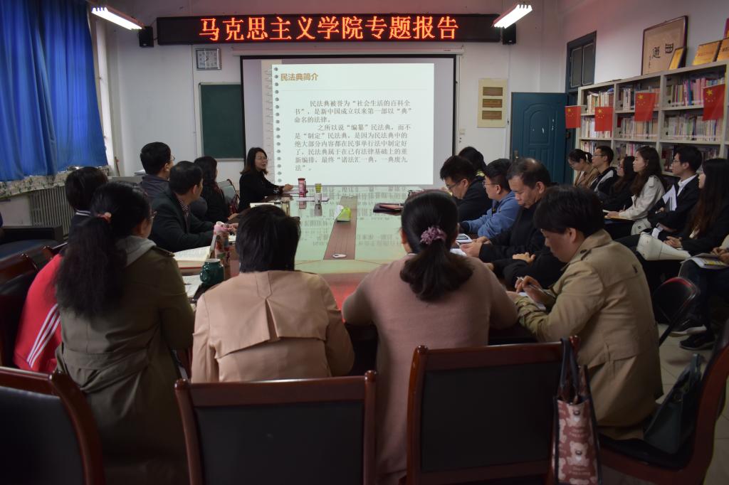 4月23日下午,我院在508会议室举办《民法典》解读专题报告会,河南正安律师事务所许恒芳主任来院主讲,报告会由王冰蔚院长主持,全体教职工参加。