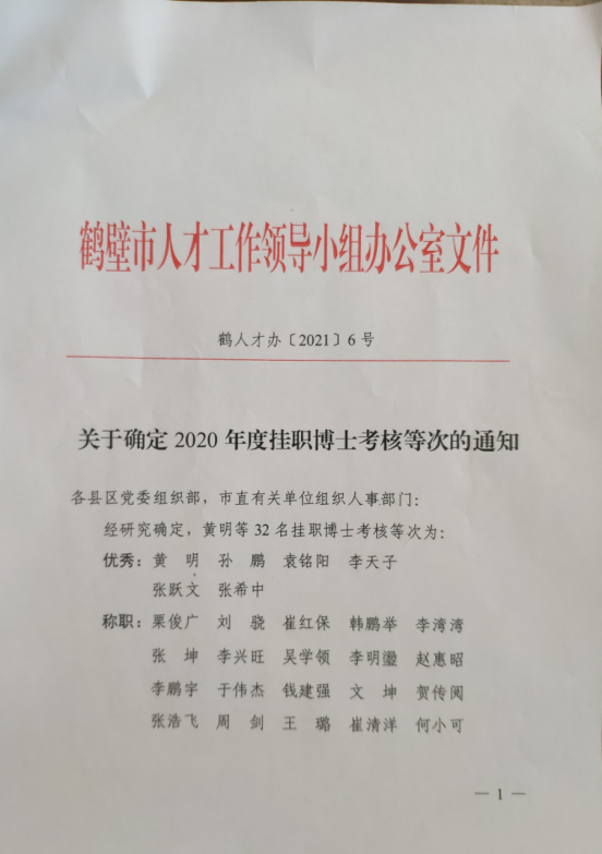 近日,鹤壁市人才工作领导小组办公室下发《关于确定2020年度挂职博士考核工作的通知》,张希中被确定为优秀等次。
