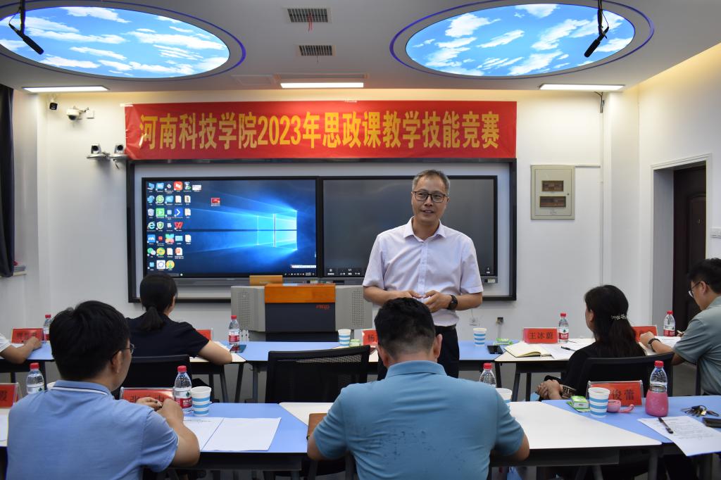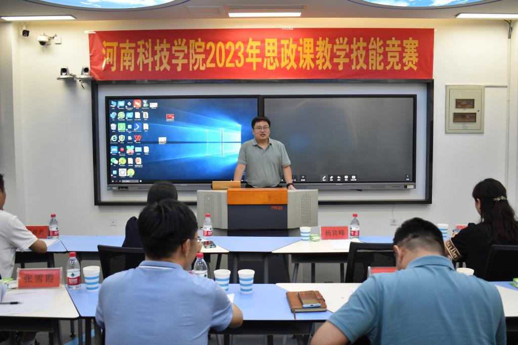 为贯彻落实全国思想政治工作会议和习近平总书记在学校思想政治理论课教师座谈会上的讲话精神,根据河南省总工会、河南省教育厅《关于在全省教育系统开展2023年度教学技能竞赛活动的通知》精神,提升思政课教师的教学能力和业务水平,6月29日下午,马克思主义学院在学校智慧教室举行了2023年度思政课教学技能竞赛。党委宣传部、校工会、教务处等职能部门负责人出席活动并全程观摩教学,学院班子成员和全体思政课教师参加活动。