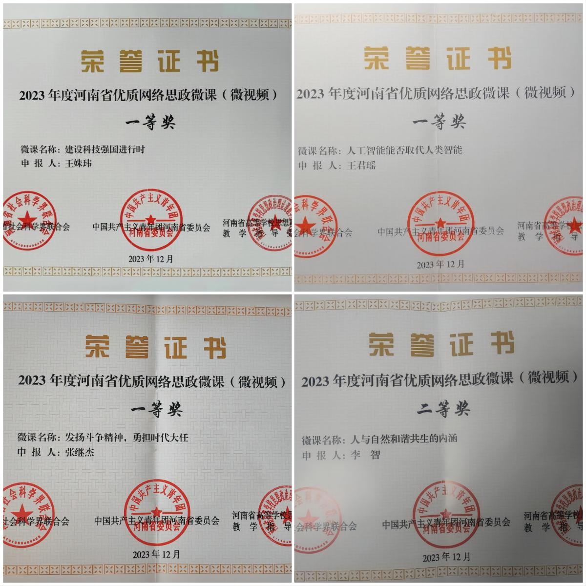 近日,河南省社科联、河南省高校思想政治理论课教学指导委员会、共青团河南省委等联合下发了《关于公布2023年度河南省优质网络思政微课(微视频)获奖名单的通知》(豫社科联字〔2023〕35号),马克思主义学院4名教师在此次评选中斩获佳绩。其中,王君瑶老师的《人工智能能否取代人类智能》、张继杰老师的《发扬斗争精神,勇担时代大任》、王姝玮老师的《建设科技强国进行时》获思政微课一等奖,李智老师的《人与自然和谐共生的内涵》获思政微课二等奖。