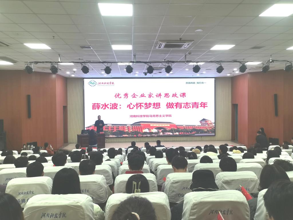 为深入贯彻习近平总书记关于思政课建设的重要讲话精神,落实教育部等十部门印发的《全面推进“大思政课”建设的工作方案》要求,着力丰富拓展思政课教学形式,增强思政课的吸引力和感染力,11月20日下午,我校邀请2002级优秀校友、河南绿丰环保工程有限公司董事长薛水波在图书馆一楼报告厅为大学生上了一节生动鲜活的思政课。马克思主义学院教师和近300名大学生聆听了思政课。