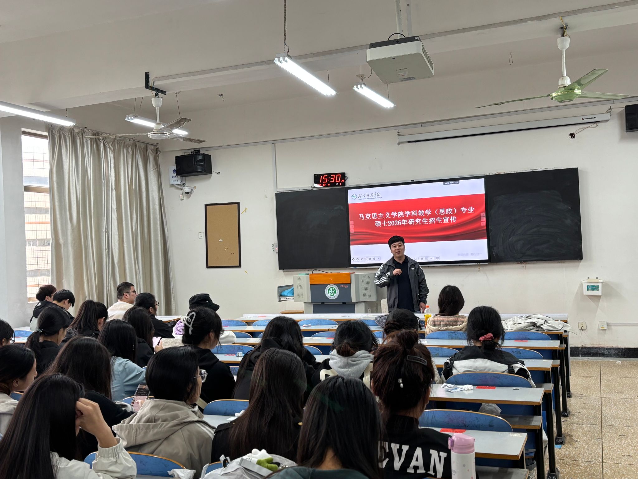 在周口师范学院的招生宣讲会上,硕士生导师靳志鹏博士面向60余名大三、大四学生就我院2026年招生专业、考试科目及学生最为关心的研究生报考条件、录取比率、研究生奖助学金、就业方向等问题做了耐心细致的讲解和现场答疑。