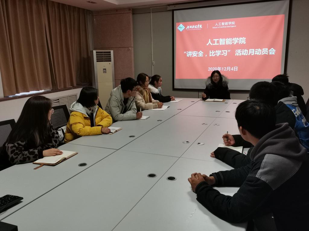 为增强学生的安全防范意识,进一步加强学风建设,人工智能学院于12月4日上午10:30在0#803会议室召开“讲安全,比学习”活动月动员会议。团委书记郭小月,各班学生干部参加此次会议。
