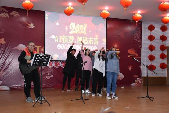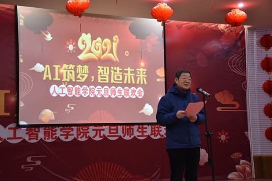 12月30日晚,人工智能学院“AI筑梦,智造未来”元旦师生联欢晚会在校工会四楼活动室举行。学院联点校领导、副校长贾积身与学院首任院长郑竹林、院党总支书记吴玲玲、院长古乐声、副院长蔡磊及全院师生欢聚一堂,喜迎2021年元旦。