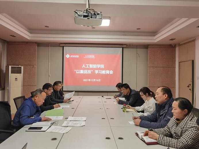 12月16日下午,人工智能学院党总支在0号楼803会议室召开以案促改专题学习教育会。学院院长古乐声、党总支副书记王秀金、副院长蔡磊等全体党员参加会议。会议由王秀金主持。