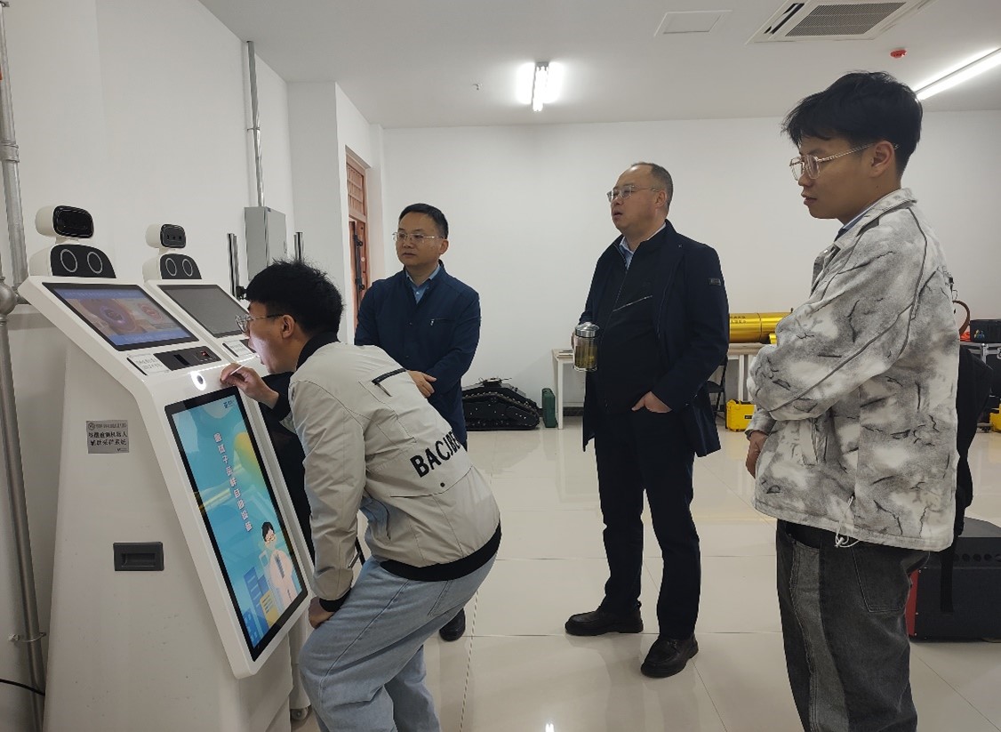 郑海良一行参观了我校智能机器人科研中试线,重点考察了学院各类型智能机器人研发情况,详细询问了咽拭子自助采样设备的研发历程。随后,双方在A108会议室举办座谈会,就关键科学问题攻关、项目申报、国家级科研平台申报、科研成果转化与应用推广等共同感兴趣的合作事项进行了深入研讨,并针对城市大型排水管涵检测、清疏、养护等无人化特种作业设备研发需求,达成了初步的联合科研攻关意向。