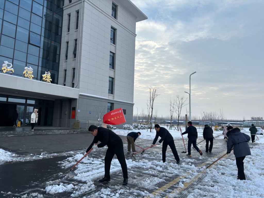 天气虽然寒冷,但是阻挡不了党员同志的如火热情,大家斗志昂扬、干劲十足,分工明确、配合默契,用铁锨和扫帚清理道路上的积雪和底层坚冰,为师生的校园出行开辟出一条“安全通道”。