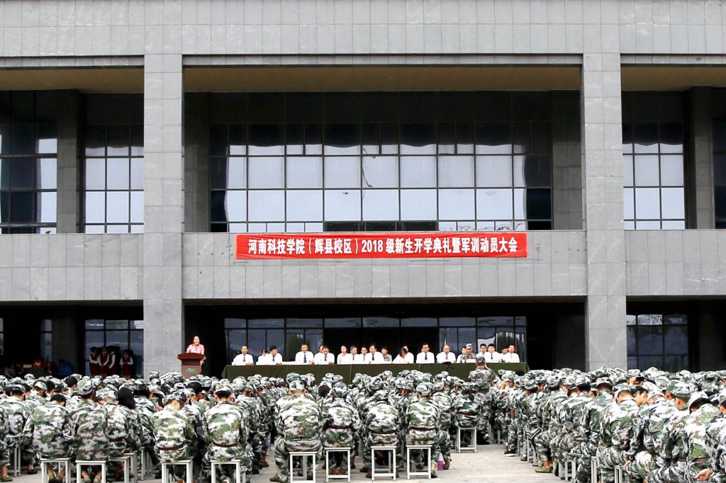 9月17日,河南科技学院(辉县校区)2018级新生开学典礼暨军训动员大会在综合楼广场隆重举行。副校长冯启高、王霞,相关职能部门负责人、帮训教官、全体2018级新同学参加大会。