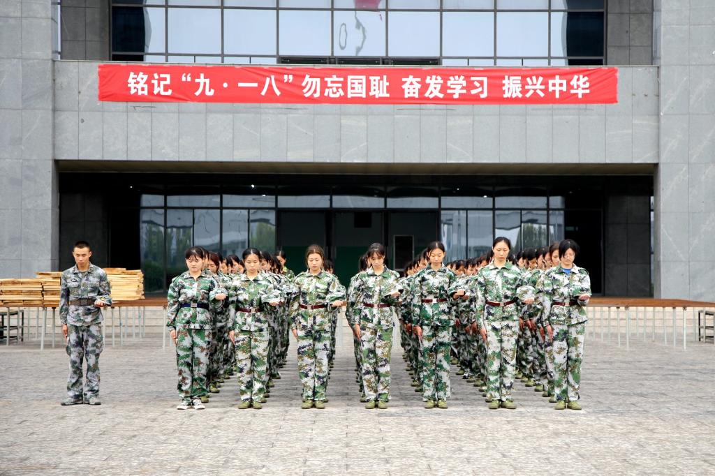 9月18日上午十点,秋雨淅沥,警笛响起,高职学院军训新生在教官的带领下,脱帽肃立,举行铭记“九·一八”勿忘国耻教育。