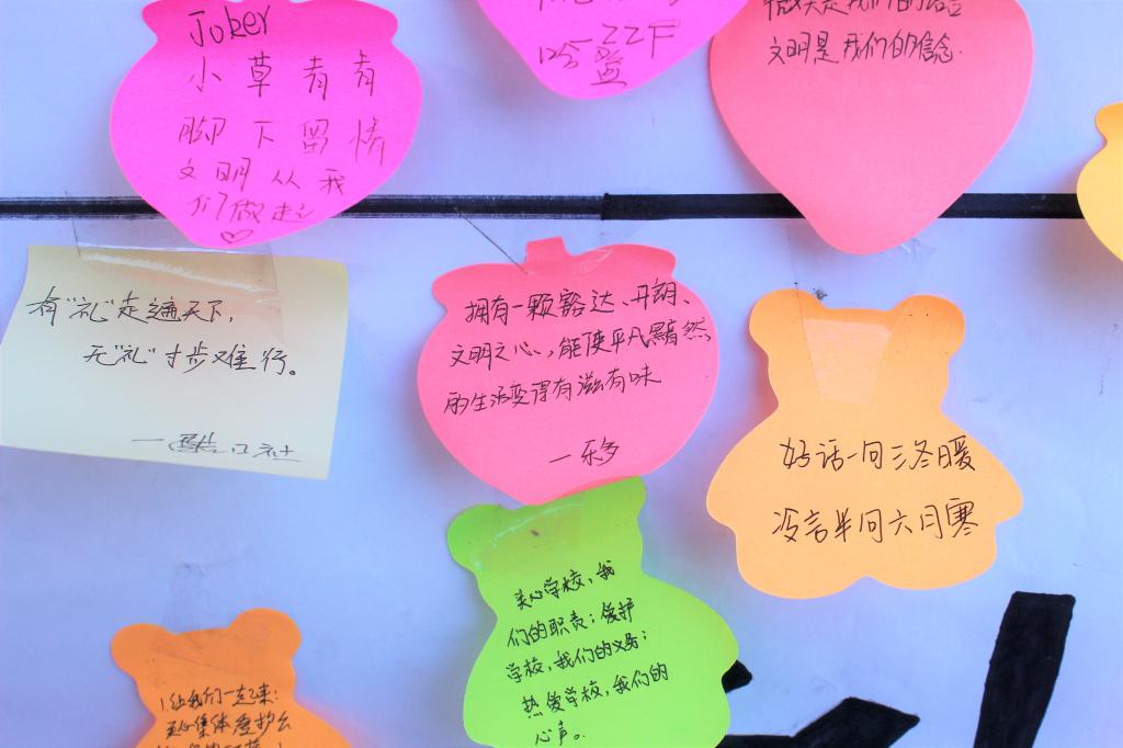 本次活动由文明寄语、文明知识竞赛、张贴投放垃圾表情包、志愿者服务四个小活动组成,活动中学生们认真填写寄语,积极竞猜辩答,用心设计表情包,规范摆放单车。