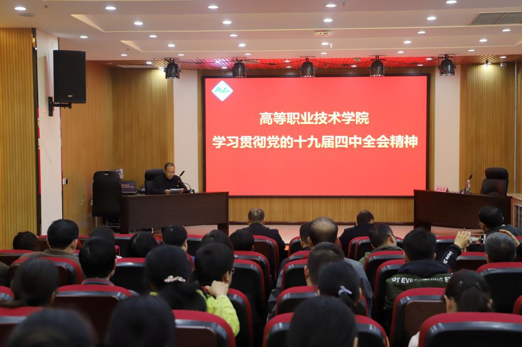 11月14日下午,高职学院在综合楼四楼报告厅召开学习宣传贯彻党的十九届四中全会精神专题会议,学院领导班子和全体教职工参加。