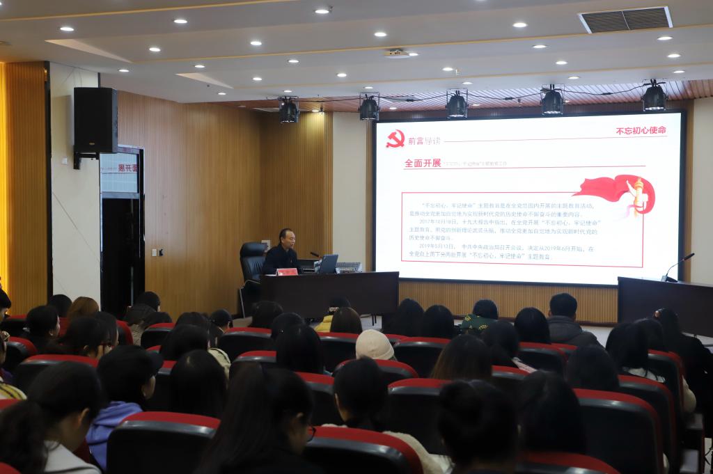 宋合成围绕开展主题教育的背景、意义、基本要求、落实“不忘育人初心、牢记树人使命”、“青年学生的责任与担当”等六个方面作了生动具体的阐述。
