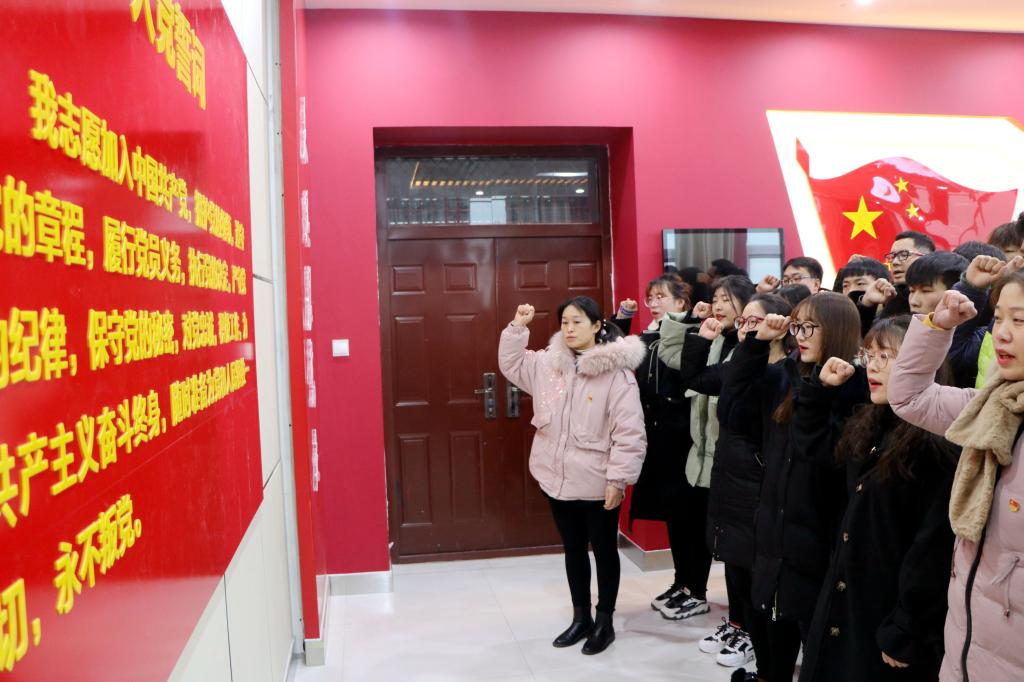 12月24日下午,高职学院新党员入党宣誓仪式在学院党建活动室隆重举行。学院党委副书记杨国友、党建办公室主任、各支部组织委员以及2019年下半年新发展入党的35名预备党员参加仪式。