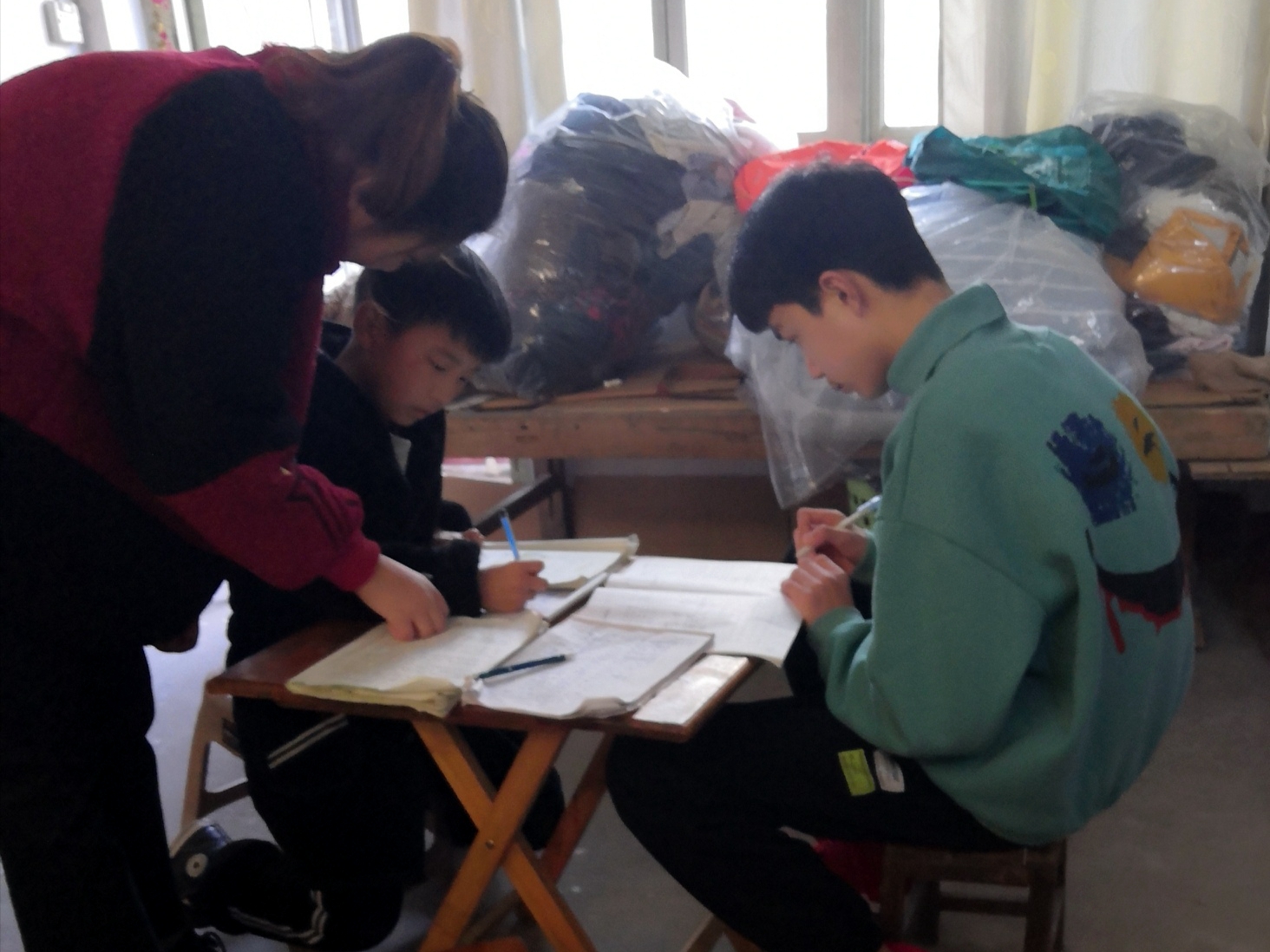 经管系18级学生张湘瀛,主动当志愿者为邻居家无人照顾的小学生提供课程和作业辅导。